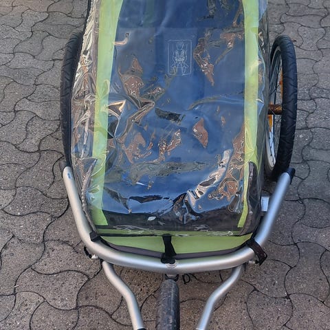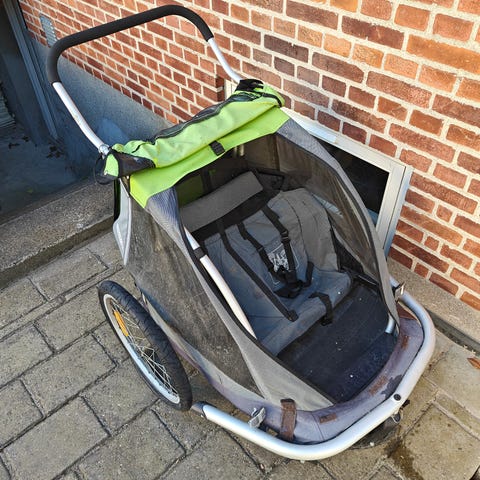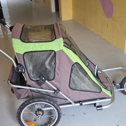 Thule trækvogn, som både kan sættes bag cyklen og fungere som løbevogn. Den fungerer glimrende, men har tydelig brugsspor.