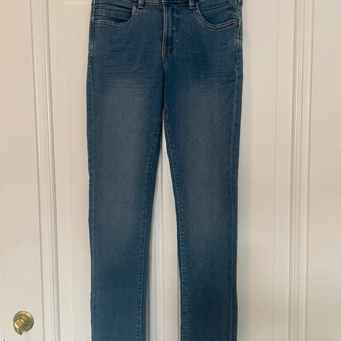 Jeans, Jeans, Add to bag , str. 170, Mørkeblå jeans i stretch med slitage-effekt på lår og knæ fortil samt på baglår. 2 lommer fortil og bagpå, lynlås-lukning samt knap. Fremstår som nye.