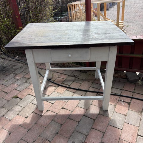 Træbord i rustik stil med én skuffe på langsiden. Bordet har kraftige ben og en massiv bordplade med patineret overflade. Velegnet som spisebord, arbejdsbord eller som dekoration i rum, hvor man ønsker et mere råt og enkelt udtryk. Materialet fremstår som massivt træ med synlige brugsspor, der giver et gammelt og enkelt udseende. Formentlig 1700-tals