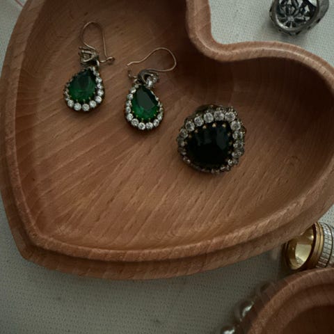 Smykkesæt bestående af armbånd og øreringe til kvinder. Sættet indeholder flere stive armbånd samt et bredt armbånd i turkis med guldfarvede detaljer og blå dekorationer. Tilhørende lange øreringe i guldfarvet metal med turkis, blå og grønne sten og perler. Egnet som accessories til festtøj eller traditionelt tøj. Materiale fremstår som metal med kunststen og kunstperler.