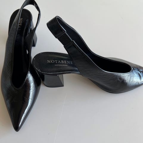 Notabene højhælede sko i str. 38 til dame. Skoene er i ruskind med ankelrem og spænde. Forfoden har en flettet rem, og hælen er middelhøj og smal. Indersålen er lys og glat, og ydersålen er designet til almindelig brug på fast underlag. Velegnet som åben sko til hverdag eller mere formelle lejligheder i varmere vejr.