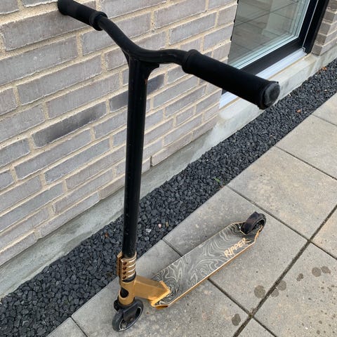 Løbehjul trick løbehjul i sort og blå. Styret er sort med blå håndtag, og decket har sort overflade med grafik. Egnede til brug som trick- eller stuntløbehjul på fx asfalt og ramper. Passer børn 120-150