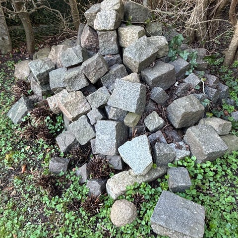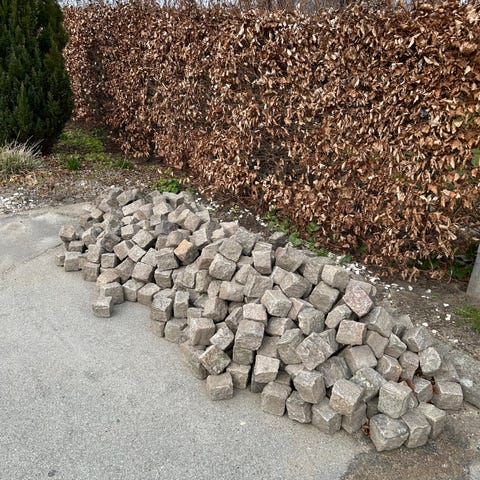 Brosten i granit i grå nuancer. 10 kr pr stk.