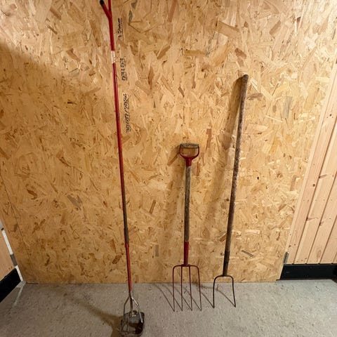Zink greb med træskaft. Greben har flere tænder i metal og et solidt træskaft med D-håndtag i plast og træ. Velegnet til arbejde i have, stald eller lignende opgaver, hvor der er behov for at løfte eller flytte hø, halm, kompost eller lignende materialer.