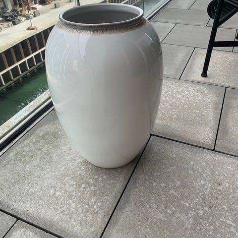 BITZ 60 cm. høj stor creme vase i enkelt, afrundet design. Vasen fremstår i en lys, neutral farve og er velegnet til dekoration med blomster eller grene samt som fritstående indretningselement i stue, entré eller lignende rum. Overfladen har en let rustik struktur med synlige småmærker og patina. Indersiden er glat, og åbningen er bred, hvilket gør den egnet til både friske og tørrede blomster, alt efter behov. Enkelte små mærker.