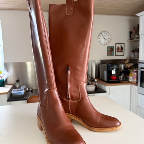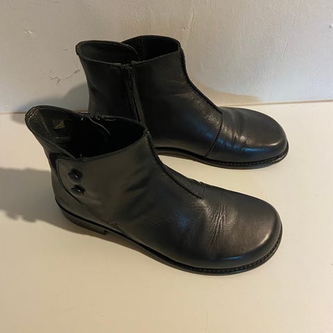 Angulus støvler i sort læder i størrelse 41. Klassisk kort skaft med elastik i siderne og rund snude. Støvlerne har kraftig hæl og lys sål med trælook mellem sål og overlæder. Velegnet som hverdagsstøvler i overgangssæsoner. Aldrig gået med ude, kun prøvet inde.