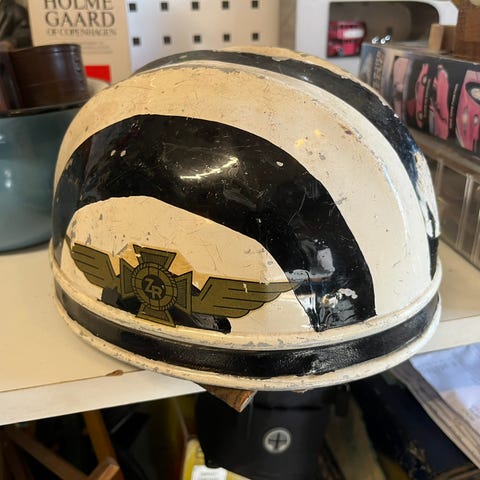 Danmarks Radio sikkerhedshjelm i hvidt materiale med rødt DR-logo på fronten. Hjelmen har indvendig svedbånd og justerbar læderrem under hagen. På siden ses mærkat med teksten "746 Ob København". Indersiden er forsynet med ophængssystem og størrelseangivelse "50". Velegnet som samlerobjekt eller rekvisit.