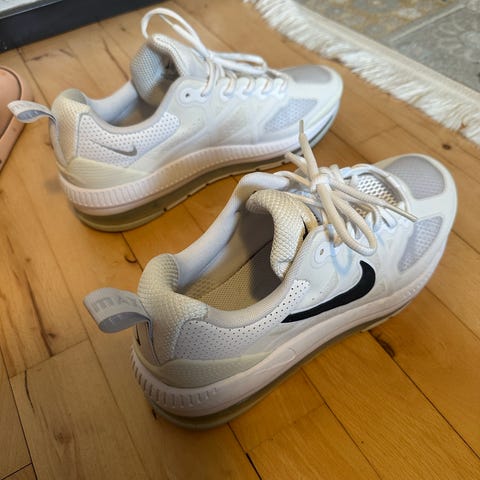 Nike Air Max Genome sneakers i str. 44. Modellen er i hvid med sort Nike-logo. Overdelen er i mesh og syntetisk materiale med snørelukning. Skoen har synlig Air Max-luftsål i fuld længde og gummisål med mønster for greb. Velegnet som hverdagssko og til let træning.