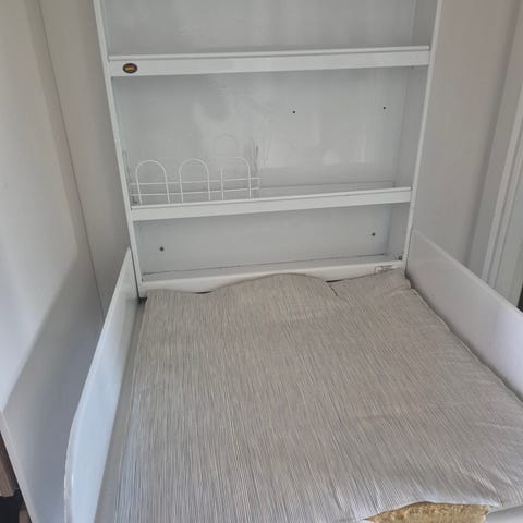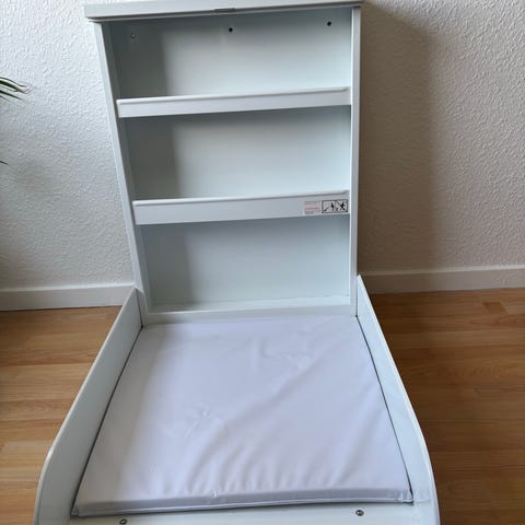Væghængt puslebord i hvidlakeret metal. God stand, fordi det kan ses det er brugt, men i god kvalitet. Der er et sted, hvor der er rust. Måske kan de vaskes af. Monteres på væg vha. tre skruehuller i bagsiden.