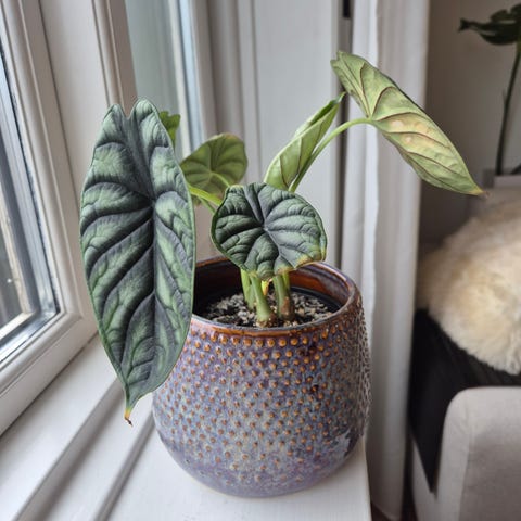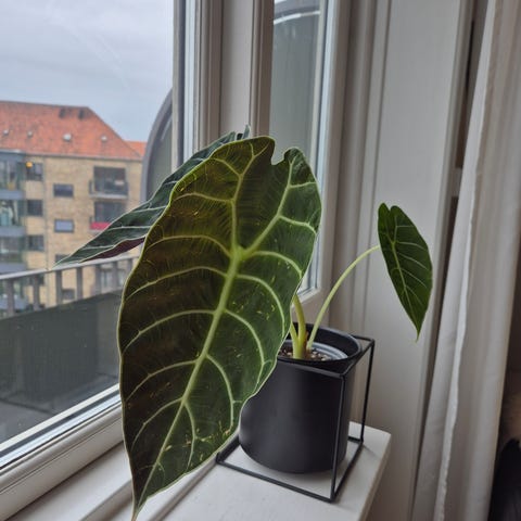 Dypsis lutescens stueplante med grønne, fjerformede blade. Planten står i en plastpotte, som er placeret i en dekorativ yderpotte i flettet naturmateriale. Egnede forhold ifølge mærkningen er en lys placering indendørs, uden direkte, stærk sol det meste af dagen. Planten kan bruges som grøn stueplante i fx stue, kontor eller andre opholdsrum, hvor der ønskes en høj, tropisk prydplante. Ikea plant.