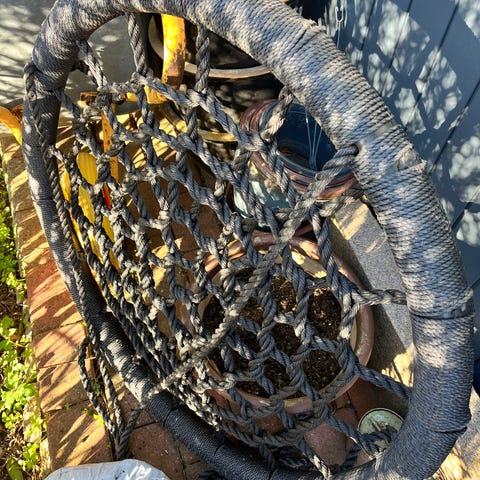 En rund gynge af robust materiale. Gyngen har hængt ude, så den har brugsspor. Diameteren er ca. 117 cm. (ydre kant til kant).