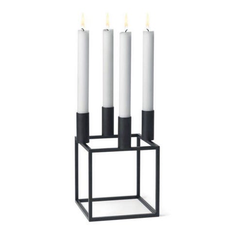 Kubuslysestage i sort metal. Kubisk design med plads til ét kronelys. Egnet til brug på bord, hylde eller vindueskarm som enkel lysestage til almindelige stearinlys.