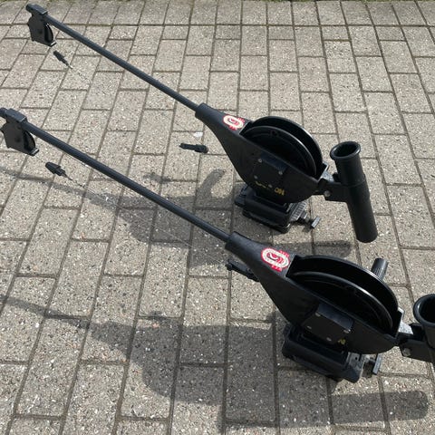 Scotty Depthpower elektrisk downrigger til bådfiskeri. Enheden er beregnet til trolling og kontrolleret fiskeri i bestemte dybder fra båd. Downriggeren har elektrisk motorhus, teleskopstang i metal, wireføring med hjul og fæste til montering på båd. På billederne ses desuden monteringsbeslag og tilbehør til brug sammen med downriggeren. Velegnet til lystfiskeri, hvor der ønskes præcis styring af agnens dybde.