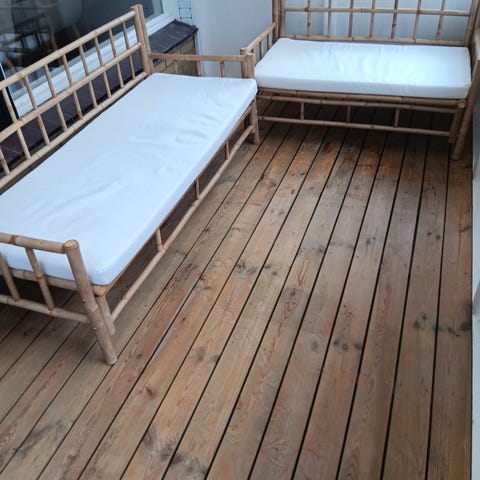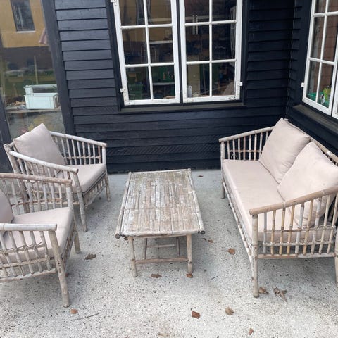 3 personer bambus loungesofa i lys naturfarve med lamelbund. B: 180 cm. D: 75 cm. Medfølgende løse hynder og puder i lys, neutral tekstilfarve. Sofaen har ryglæn og armlæn i bambus på tre sider, hvilket giver støtte ved siddende brug. Perfekt til afslapning i haven eller på den rummelige altan. Har stået i læ, da den har boet på vores altan og med overtræk på ved regnfulde dage. Købt i Ilva. Kvittering haves ikke længere. De farvede hynder følger ikke med. Beige betræk kan tages af og vaskes. Enkelte pletter og brugsspor på stoffet (se billeder) som kan fjernes med en tur i vaskemaskinen.