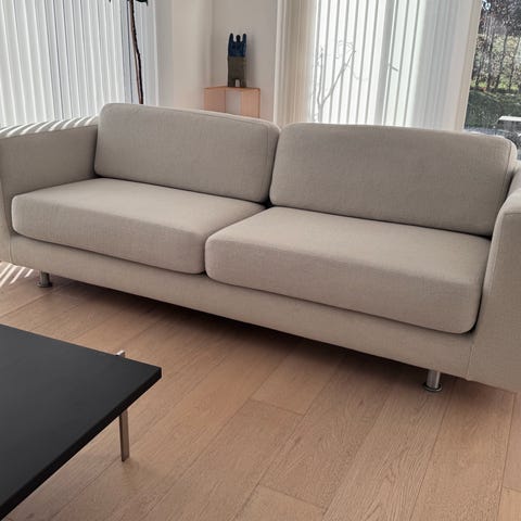 Erik Jørgensen sofa i falmet coboltblå. Sofaen er mørnet efter at have stået i udestue med sol. Kun brugt ganske lidt. Trænger til ny betræk. 220 cm lang.