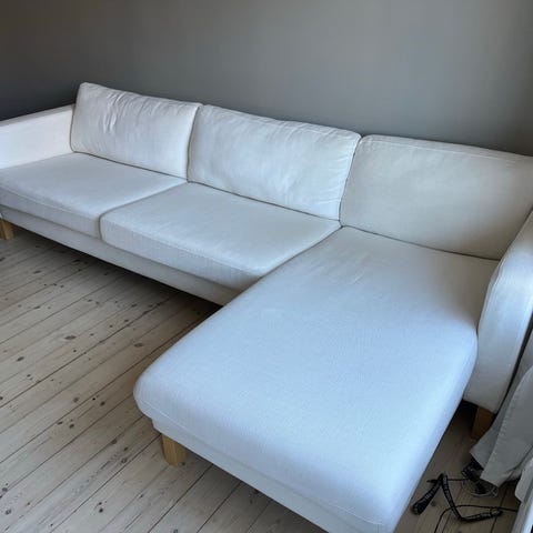 Dejlig flydersofa i småtriflet beigefarvet fløjl. Sofaen har ingen pletter eller huller, og vi har været meget glade for den og sælger kun fordi vi har været nødt til at købe en sovesofa. Hurtigt afhentning prioriteres :)