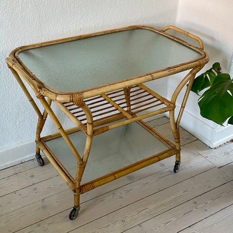 Rullebord i bambus/rattan med grøn laminatbordplade.
