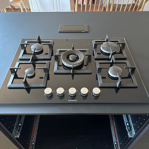Siemens gaskogeplade med betjeningsknapper i front. Kogepladen har flere gasblus og kraftige riste, egnet til madlavning i køkken med gasinstallation. Overfladen er i et glat materiale, som typisk er let at rengøre efter brug. Velegnet som indbygningskogeplade i standard køkkenbordplade med gasforsyning.