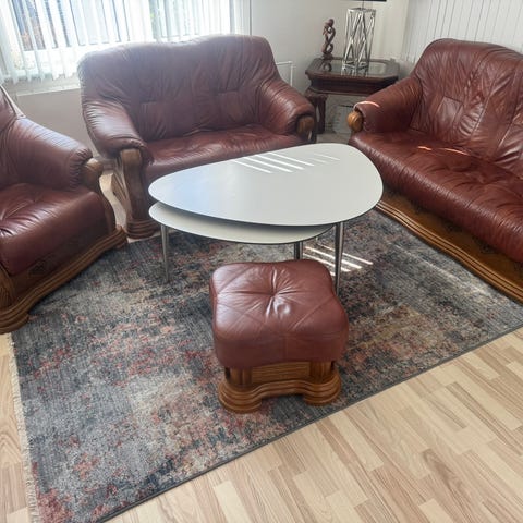 Sæt bestående af sofaer og lænestol i lys bøg med tremmeryg og armlæn. Hynder og ryglæn er polstret med mørkegråt stof. Sofaerne har rette sæder med løse hynder. Lænestolen har rundet ryg og matchende grå polstring. Velegnet til stue eller udestue, hvor der ønskes et lyst træmøbel med enkel, polstret siddekomfort.