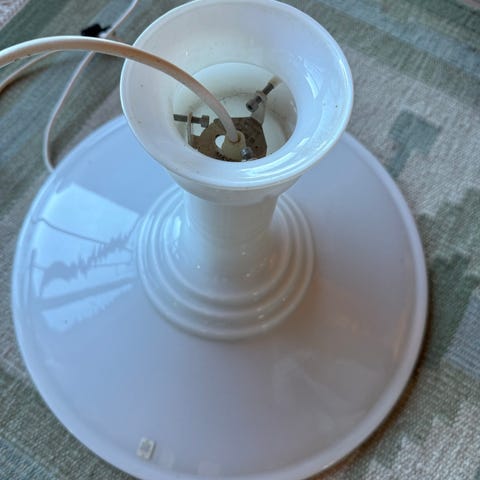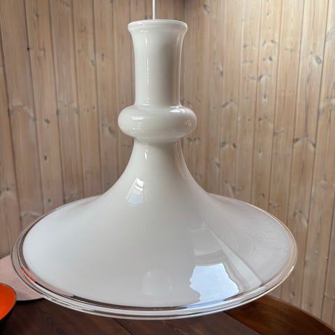 Holmegaard kro-pendel i hvidt glas designet af Sidse Werner. Lampen er udført i opalhvidt glas med rund, klokkeformet skærm og åbning foroven til fatning og ledning. Indersiden er ligeledes hvid, hvilket giver en jævn lysfordeling nedad. Velegnet som loftslampe over bord eller i opholdsrum. Bruges med standard pære i passende fatning efter producentens anvisninger.