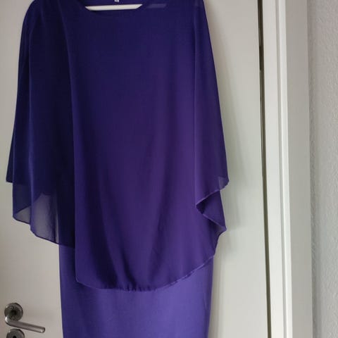 Består af ærmeløs, helforet kjole med lagdelt skørt samt matchende let gennemsigtig jakke med asymmetrisk snit.