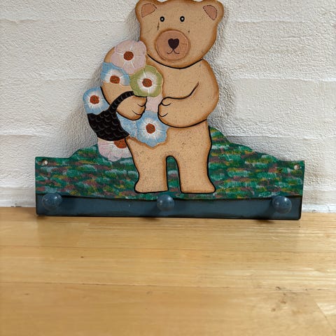 knagerække med 5 knager. Vægmonteret knagerække designet med fem separate knager i mørk farve på en lys bagplade. Egnet til ophæng af jakker, tasker eller tilbehør i entré, gang eller andre rum, hvor der er behov for ekstra ophængsplads.