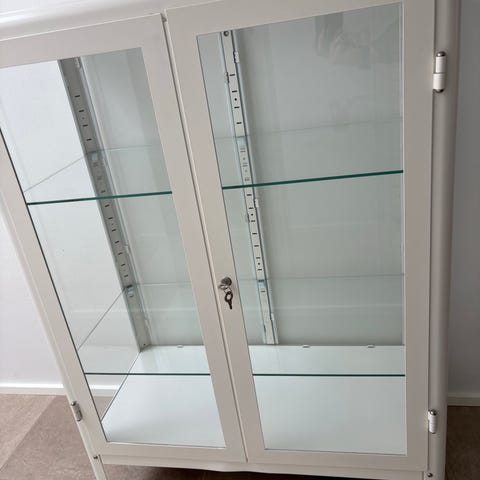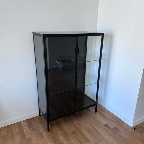 IKEA vitrineskab i metal og glas designet af Anders Pehrson. Skabet har to glaslåger på fronten og sider i glas, som giver godt indblik til indholdet. Indvendigt er der flere glashylder, der kan bruges til opbevaring og udstilling af for eksempel service, glas eller pyntegenstande. Kabinettet er i metal med mørk overflade og står på fire ben. Velegnet til brug i stue, spisestue eller køkken til overskuelig og støvbeskyttet opbevaring.