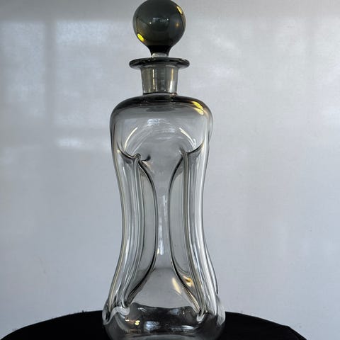 ikonisk Holmegaard klukflaske med prop, sandsynligvis en 3-søjlet model.