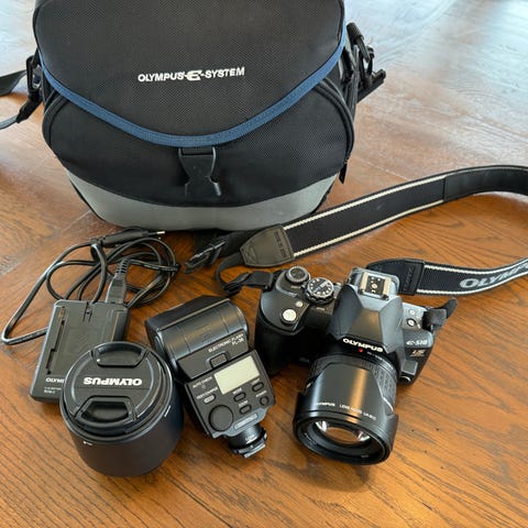 Et utrolig godt, men ældre kamera med standard linse og ekstern blitz model FL-36 Olympus. Det medfølger kun 1 batteri til kamera. Har ikke været brugt meget så er i en utrolig god stand. Det sælges fordi det ligger og ikke bliver brugt. Et utrolig godt spejlrefleks kamera