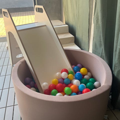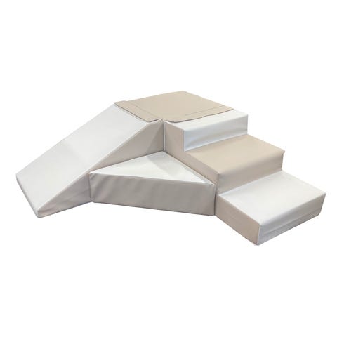 Bonlulu skumlege rutsjebane legesæt i hvid og babyblå. Sættet består af flere moduldele i fast skum, der kan sammensættes til rutsjebane, trapper og siddeelementer. Overfladen er betrukket med glat materiale, der er let at tørre af. Velegnet til indendørs brug i børneværelse, legerum eller institution, hvor børn kan kravle, klatre og rutsje på de bløde elementer.