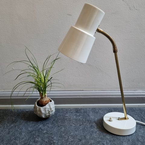 Meget retro og meget brugt (rustik) sengelampe / væglampe med tidstypisk fleksarm i messing og skærm+basis i beige/hvidt metal. Sælges, som den er, med en del "patina" - måske som projekt. Men den virker som den skal - også afbryderen. Mål: højde til top af skærm som på billedet: 31 cm. Skærmhøjde 16 cm. Alm stor fatning (E27). Kan hentes i Kbk/Rådhuspladsen, i Odense M eller sendes gerne. Se flere lamper - søg HNI-lamper på DBA.