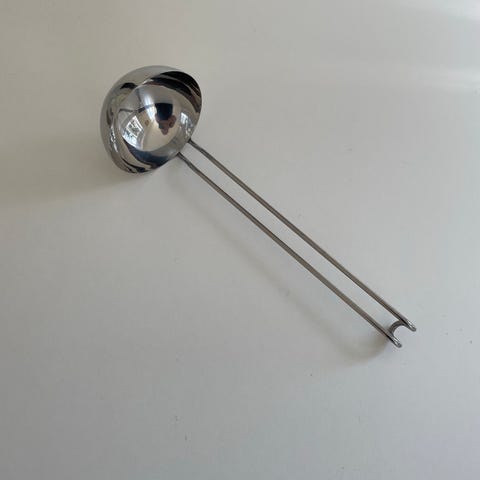 Eva Solo sigte i rustfrit stål med fintmasket net. Diameteren er ca. 20 cm, som vist på målebåndet på billedet.