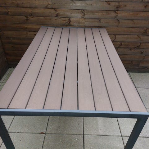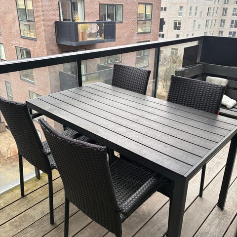Bordet og 5 stole med hynder er egnet til udendørs brug på terrasse eller i have. De viste mål på billederne angiver en bredde på ca. 100 cm og en længde på ca. 200cm.