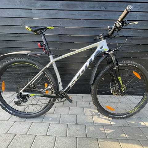 Scott scale mountainbike til unisex med stelstørrelse L og 29" hjul med top udstyr, se billede.