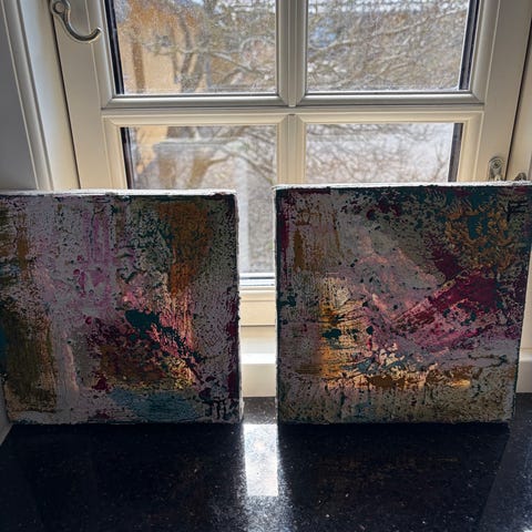 Merete Kaae Elefant IV maleri i akryl på lærred i flerfarvede nuancer samt yderligere et værk af samme kunstner. To abstrakte, farverige kompositioner og konturtegninger, herunder et med elefantmotiv. Glade værker med masser af farver. Sælges for kr. 600,- pr. stk. eller samlet for kr. 1.000,-.