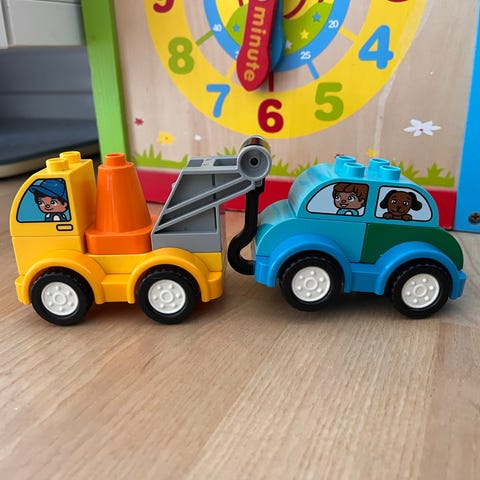 LEGO DUPLO legetøjsbiler bestående af to køretøjer. Sættet inkluderer en blå bugseringsbil og en gul bil med figurer i vinduerne. De store DUPLO-klodser er velegnede til små børn, da de er nemme at holde om og samle. Kan bruges som supplement til andre LEGO DUPLO sæt og til rolleleg med køretøjer.