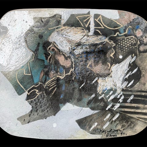 Rektangulært keramikfad med abstrakt landskabsmotiv flerfarvet