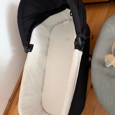 Køreposen har blød, lys inderside og åbninger til seler, så den kan bruges i klapvogn eller barnevogn.