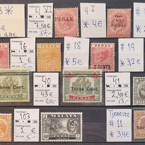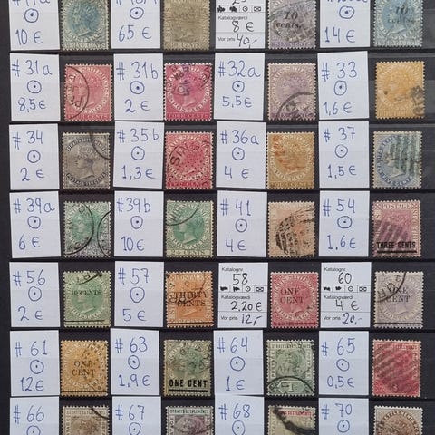 Michel 2017 katalog værdi 380,1 euro = 2.850 dkr. Inkl. 12 Victoria mærker, og 8 overtryk / provisorier. Opsat efter Michel katalog nummer. Straits Settlements (1826 til 1946) bestod af uafhængige bosættelser: Malacca, Penang og Singapore. Fra 1907 blev også Labuan, en ø ud for kysten af Borneo indlemmet. Med undtagelse af Singapore er alle disse områder senere blevet en del af Malaysia. Straits Settlements var en engelsk koloni. Ustemplet betyder uden gummi eller med hængselspor. I almindelig pæn kvalitet, enkelt småfejl. Sendes gerne, uden planche, mod dækning af porto. Spar porto, se venligst mine andre frimærke- og postkort tilbud. Sælges UNDER 10 % af katalogværdi