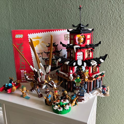 Samlingen består af flere forskellige LEGO NINJAGO modeller, herunder drager, køretøjer og bygninger. Modellerne er samlet og udstillet på hylder, som vist på billederne.