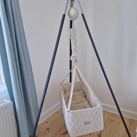MoonBoon vugge til ophæng i tekstil i hvid farve. Vuggen har stropper til ophæng i loft eller stativ og en blød kant rundt indvendigt. Madrassen har betræk i lyse farver. Velegnet til spædbørn som soveplads indendørs.