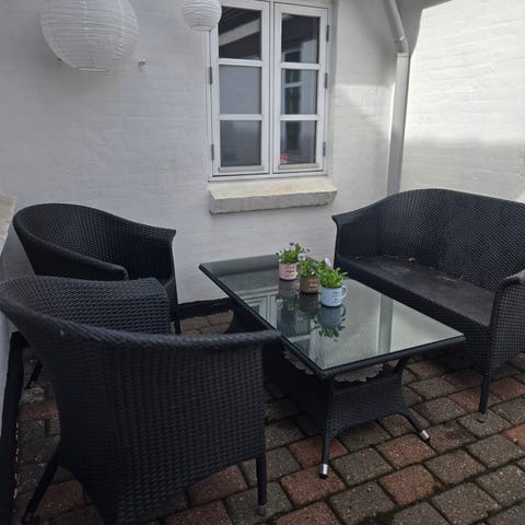 Flot og hyggeligt loungesæt i beige, perfekt til altan, terrasse eller udestue.