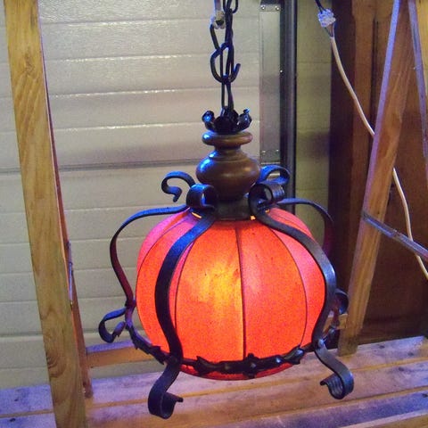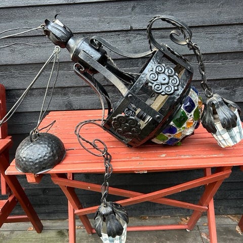 Flot lampe med udsmykning, bærekæde og loftroset i smedejern og råglas.