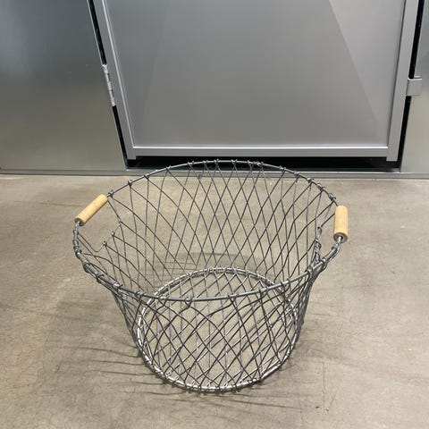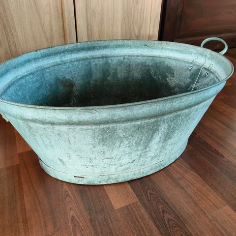 Stor flot zinkbalje med håndtag af reb og fin patina