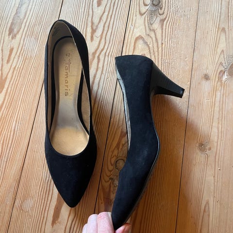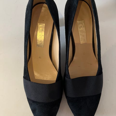 Gabor festsko til dame i størrelse 37. Skoene har spids snude og mellem-høj hæl. Farven fremstår som sort/mørk, med en kombination af glat og ruskindslignende materiale på overdelen. Ydersålen er i gummi med mønster for bedre greb. Velegnet som pæne sko til fest og andre formelle anledninger.. ny pris 900kr. Nu 200kr