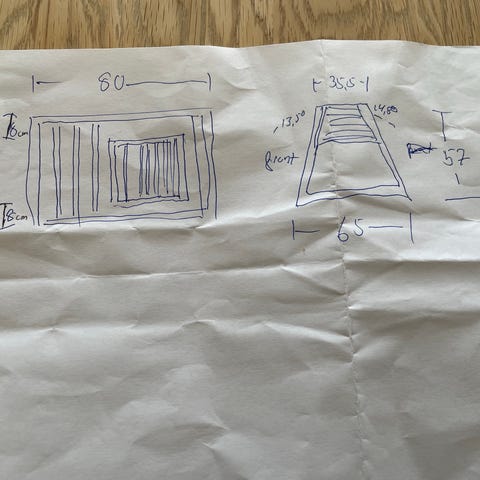 Trapezformet hjemmelavet hundebur til bilen, med mål som angivet på tegningen.