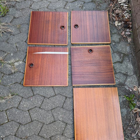 Overskabe i teak træ med messing hasper og fire låger Ca. mål 1 stk. L 176 cm 15 cm i bund 25 cm i top 35 cm i bag 33 cm skrå front. 1 stk med samme mål dog 220 lang. 1 stk. L 280 15 cm i bund 20 cm i top 29 cm i bag.