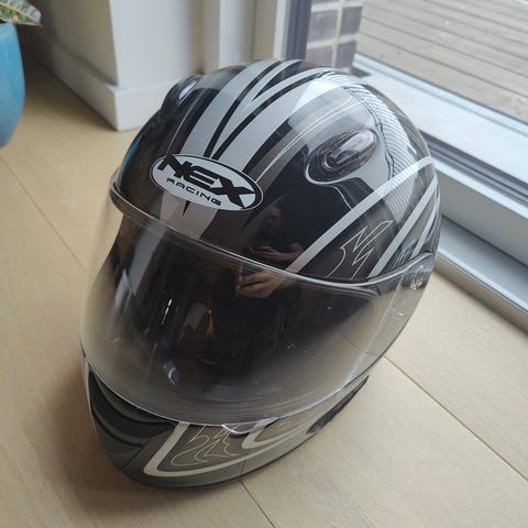AGV motorcykelhjelm i grå og sort med grafisk mønster. Hjelmen har klart visir og er i fin stand.