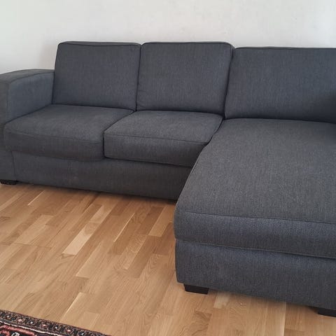 Pæn grå sofa med chaiselong. Længde: 215 og 138 ( chaiselongen), siddedybde 65 og siddehøjde 41