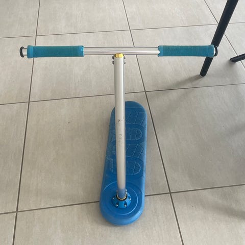 Det er et blåt indo trampolin løbehjul Med blå håndtag og et metal styr det er 75 cm højt. Det er mest til børn i alderen 8-15